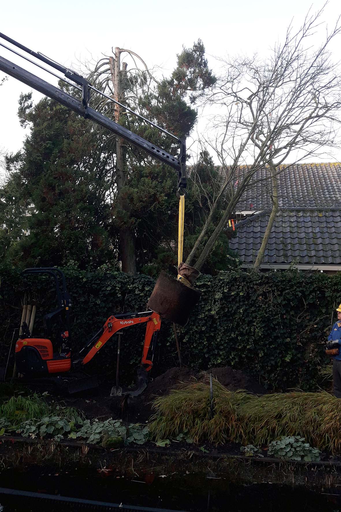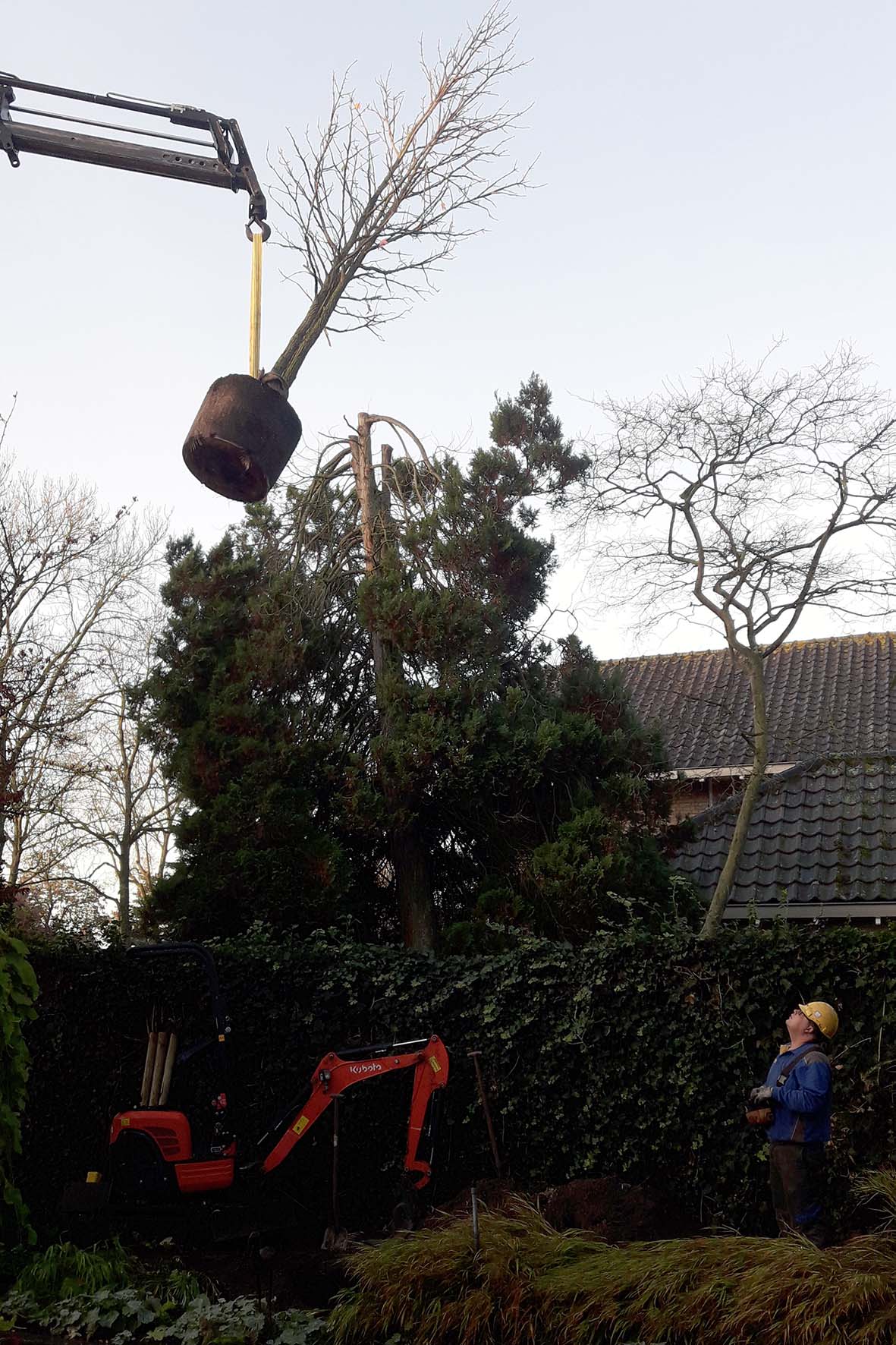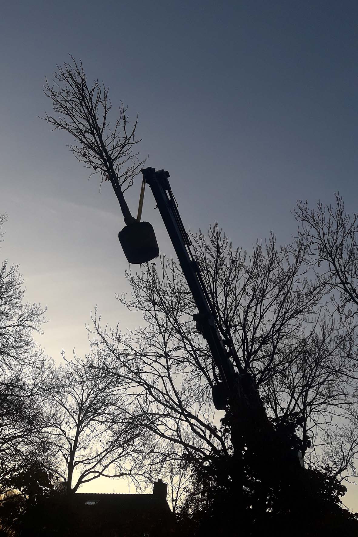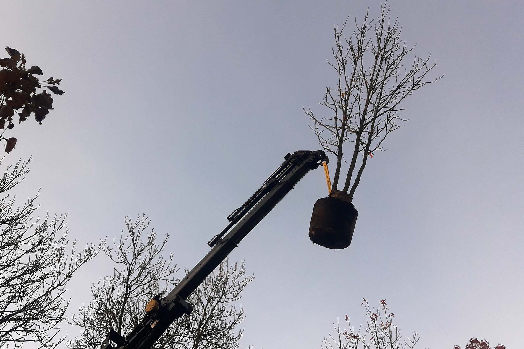 Plaatsen bomen met behulp van een kraan Soms is een boom te zwaar of groot om met de hand te plaatsen. Ook kan een locatie onbereikbaar zijn op een normale manier. Dan is een kraan een uitkomst om een boom toch te kunnen plaatsen: