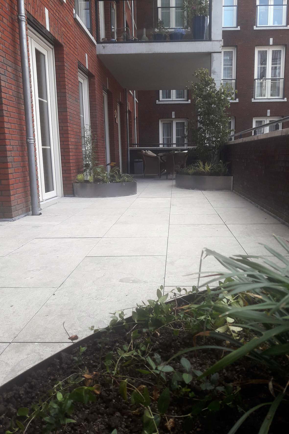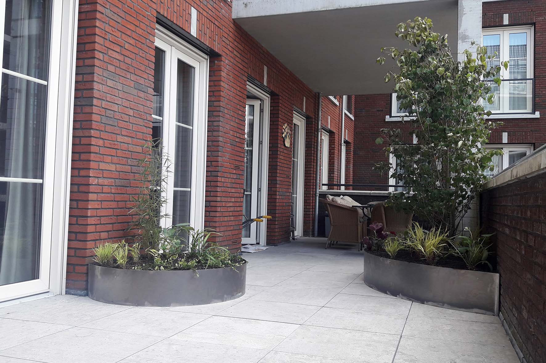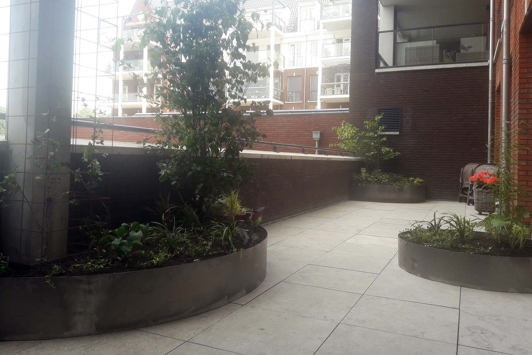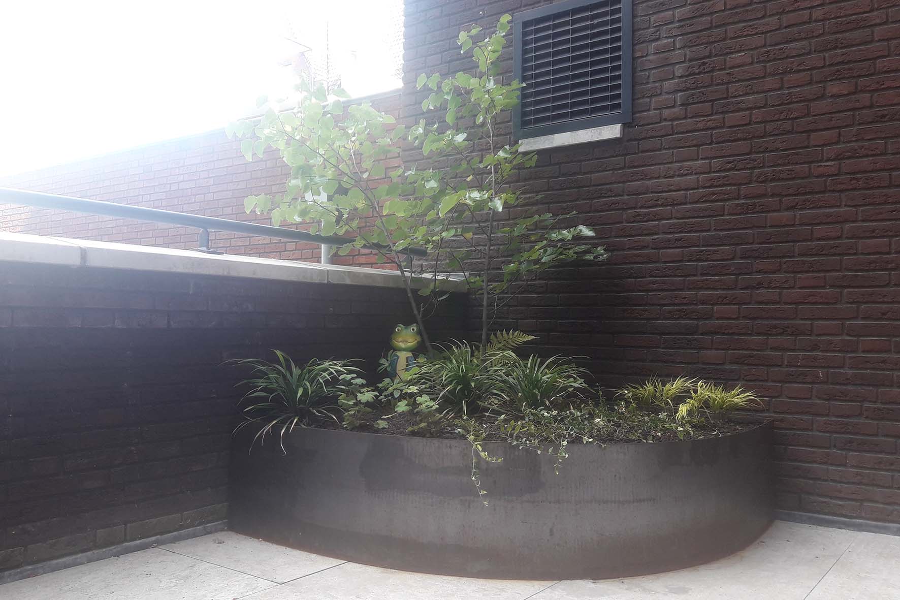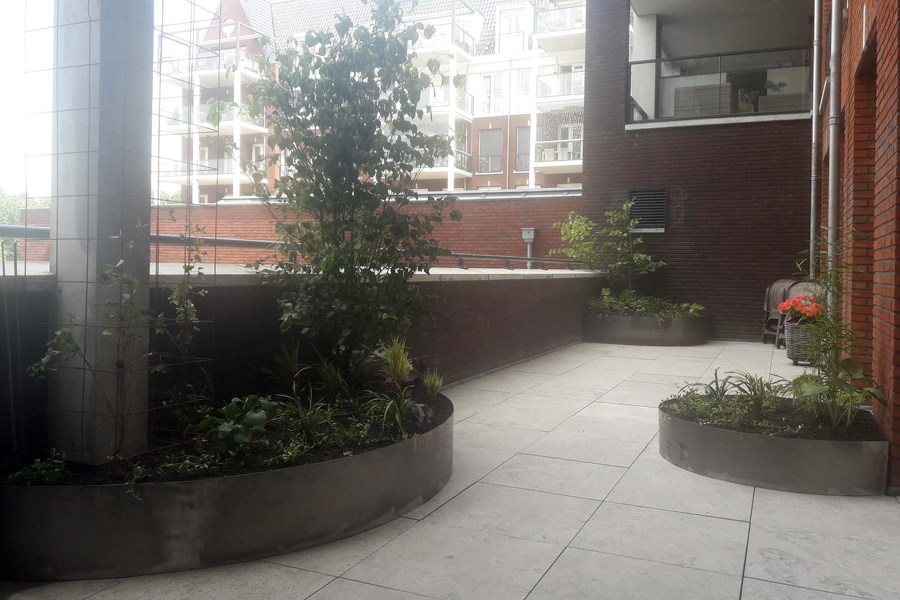 Op een dakterras in Tilburg zijn op maat gemaakte bloembakken van Cortenstaal geplaatst. Het dakterras krijgt weinig zon, vandaar dat hier is gekozen voor beplanting die goed tegen schaduw kan. Om hoogte te krijgen is gekozen voor struikvormen van Kornoelje (Cornus kousa ‘Chinensis’) , Judasboom (Cercis canadensis) en bamboe (fargesia spp). Be bloembakken zullen in de loop van de tijd hun karakteristieke roest-bruine kleur krijgen.