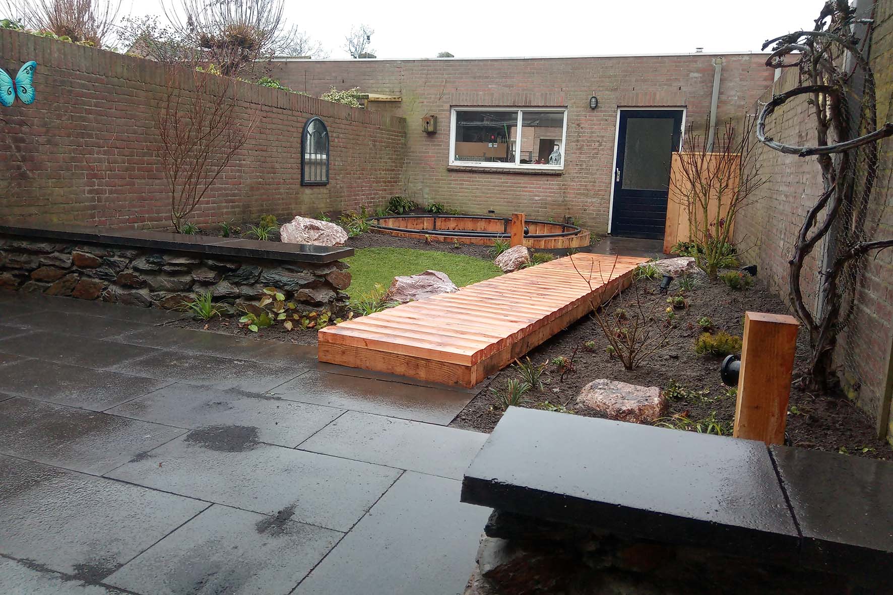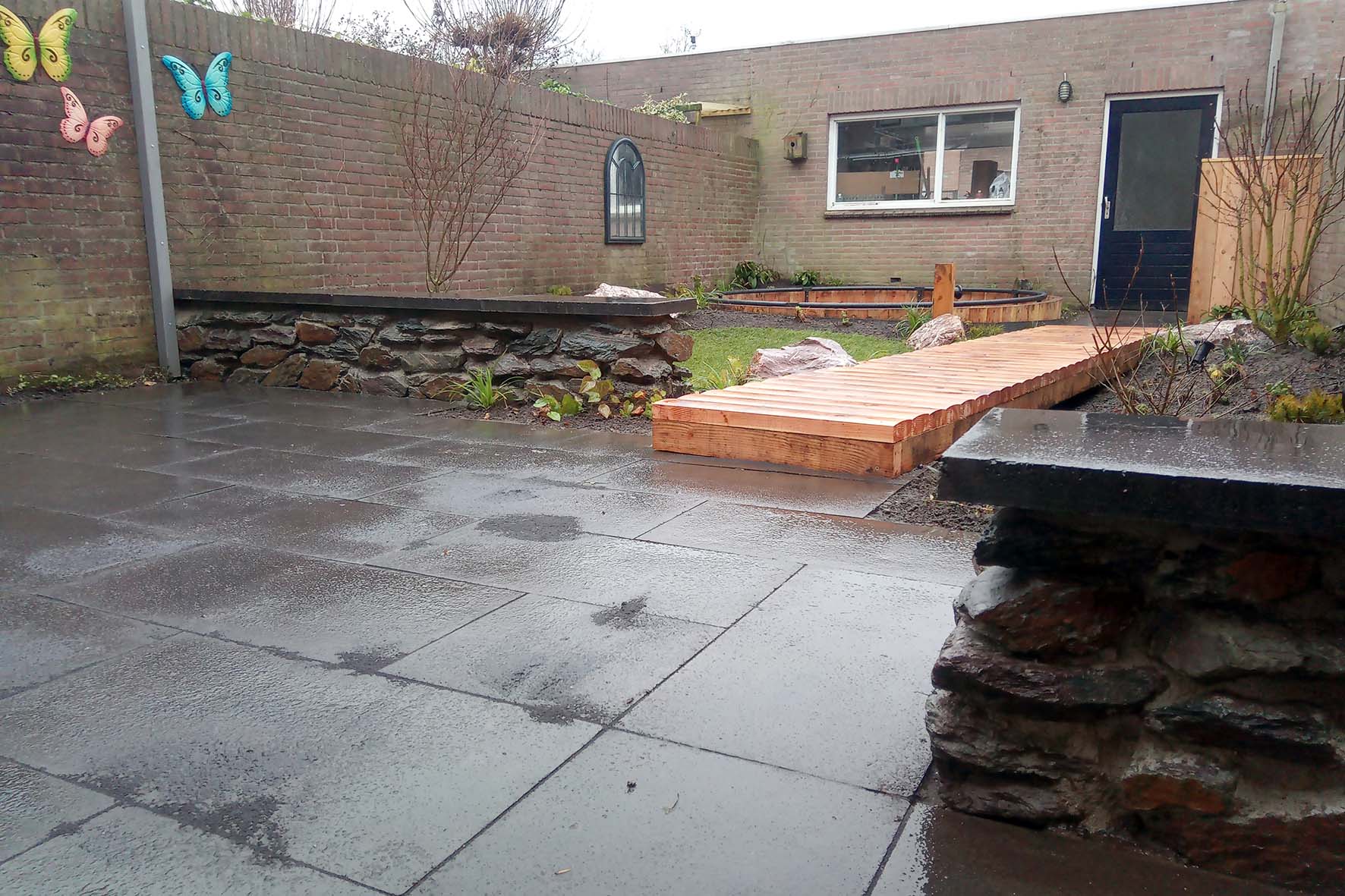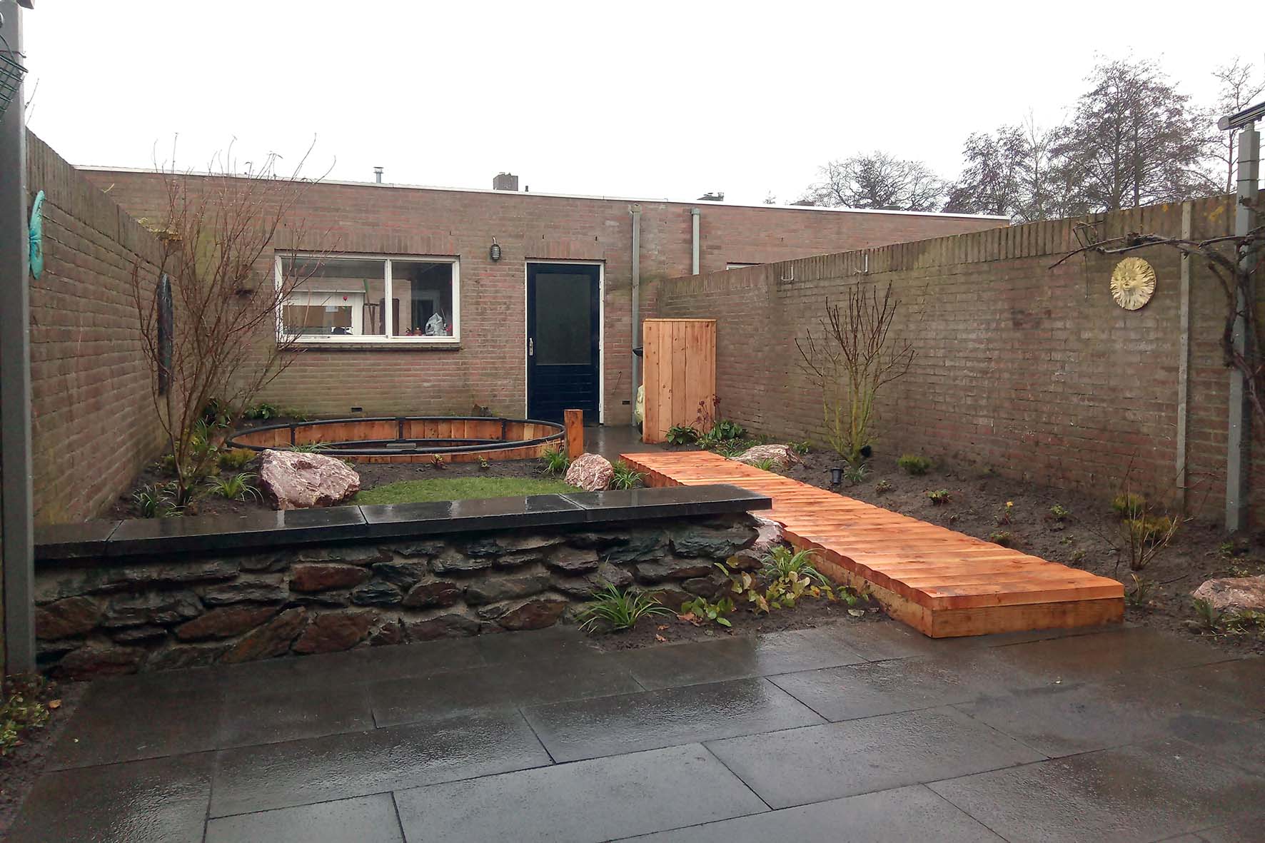 In deze achtertuin in Waalwijk is een tuin gemaakt met stoere materialen. Een trampoline moest in de tuin geplaatst worden voor de kinderen. Deze is verzonken aangebracht, waarbij de beschoeiing is gemaakt van Dougals balken. Wanneer de trampoline niet meer nodig is, dan kan deze ruimte met een kleine ingreep gebruikt worden voor een verdiept terras. Tegen het huis is het terras gemaakt van Schellevis tegels (80×40 cm). Natuurstenen muren zorgen voor dieptewerking in de tuin en hiermee worden tevens extra zitplaatsen gecreĆ«erd. Vanaf het terras naar achteren is een vlonder gemaakt Douglas balken, als brug over het gras en de beplanting.