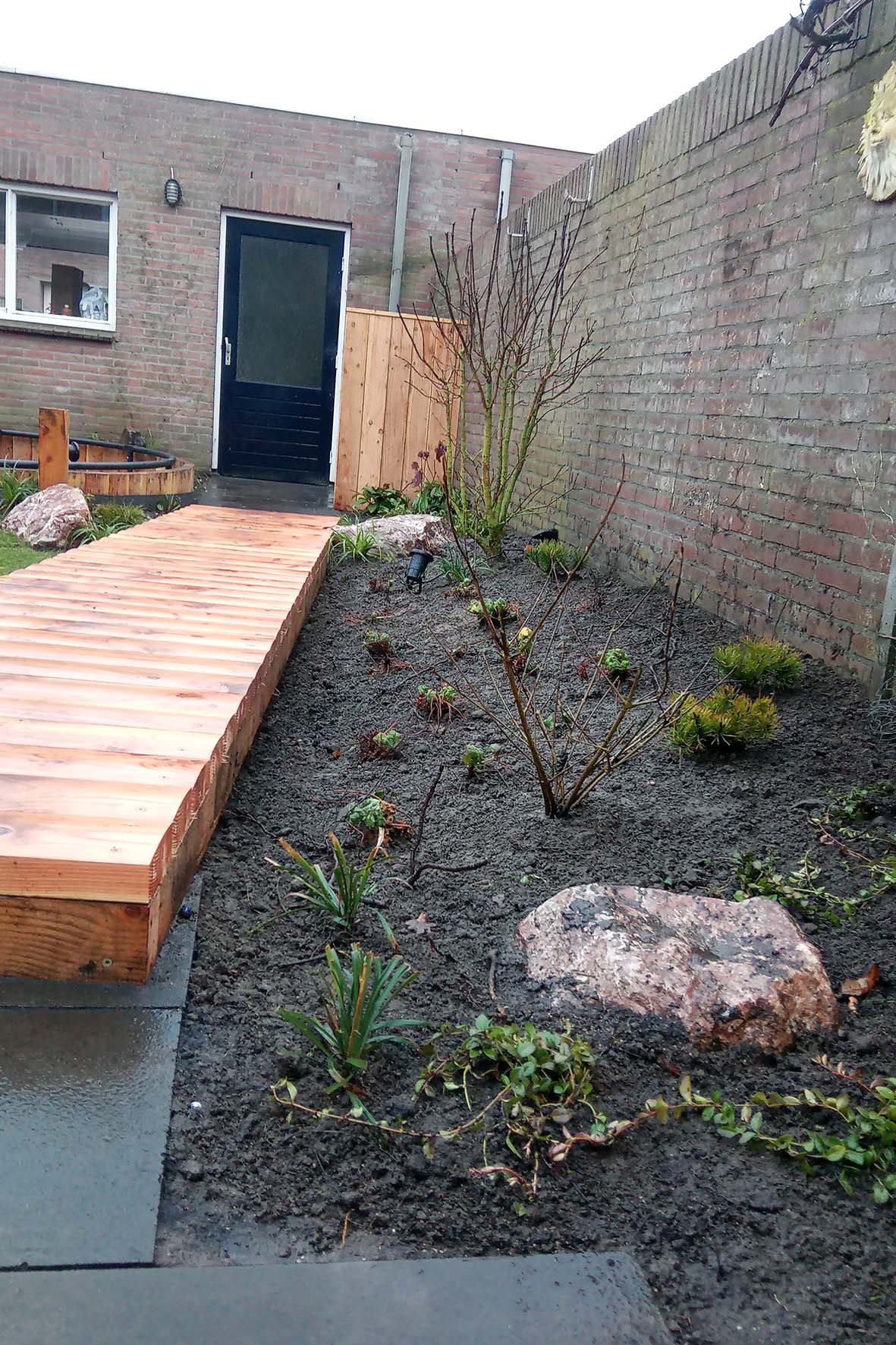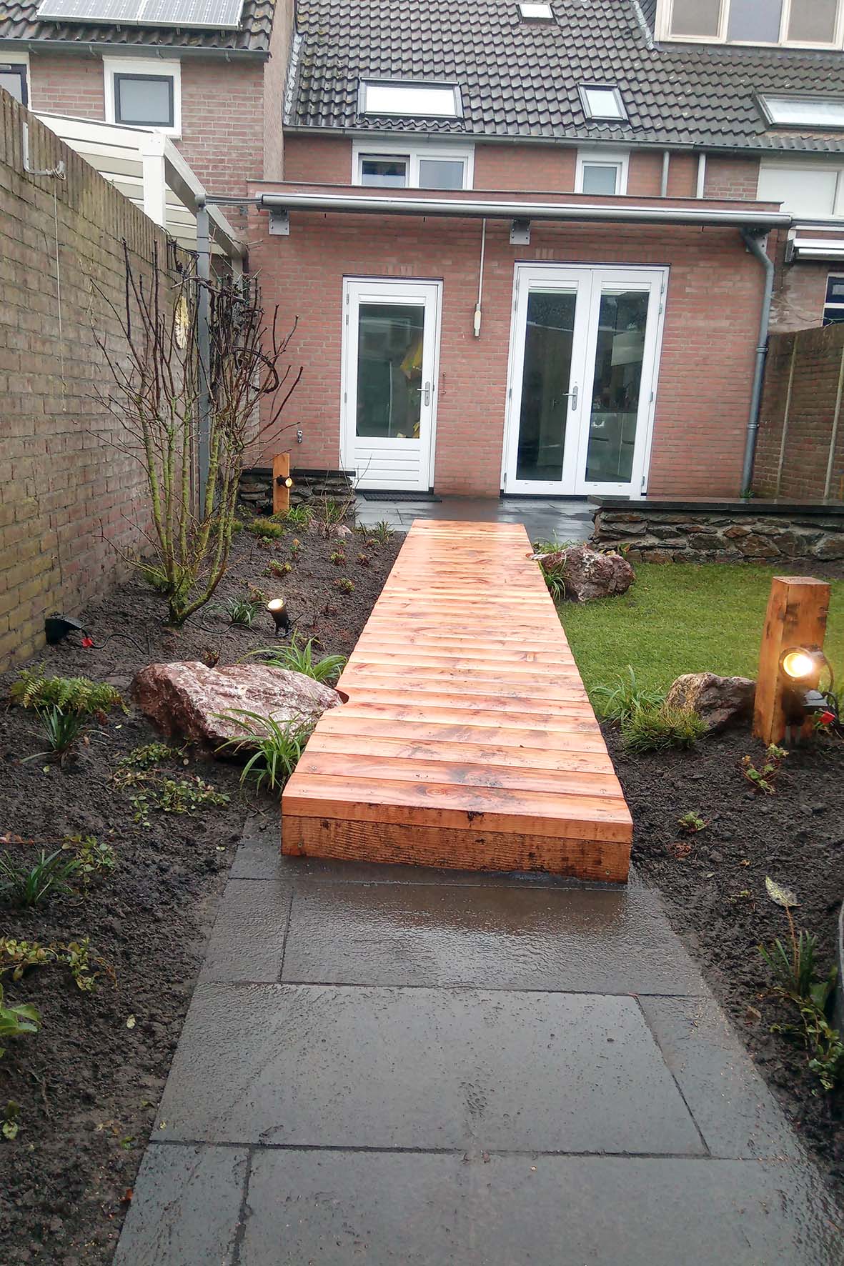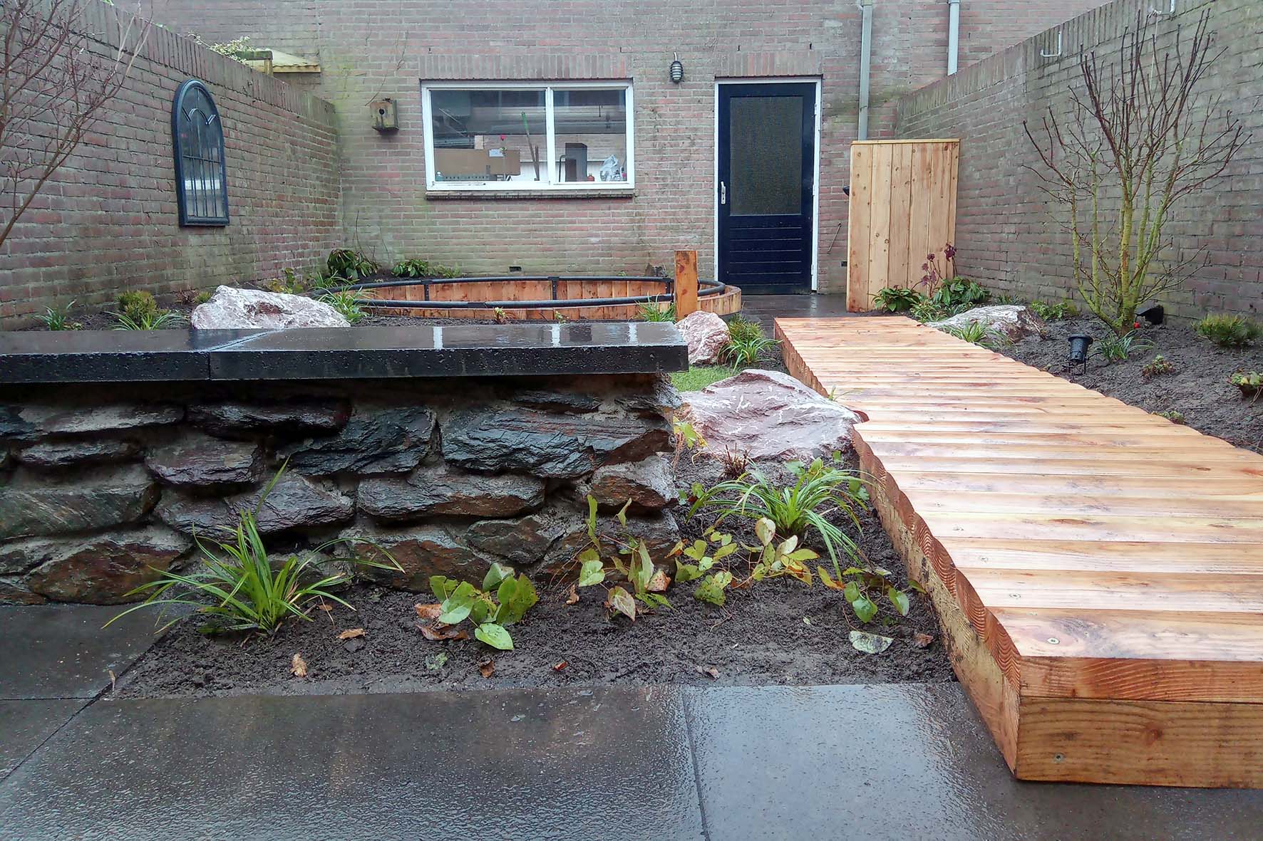 In deze achtertuin in Waalwijk is een tuin gemaakt met stoere materialen. Een trampoline moest in de tuin geplaatst worden voor de kinderen. Deze is verzonken aangebracht, waarbij de beschoeiing is gemaakt van Dougals balken. Wanneer de trampoline niet meer nodig is, dan kan deze ruimte met een kleine ingreep gebruikt worden voor een verdiept terras. Tegen het huis is het terras gemaakt van Schellevis tegels (80×40 cm). Natuurstenen muren zorgen voor dieptewerking in de tuin en hiermee worden tevens extra zitplaatsen gecreĆ«erd. Vanaf het terras naar achteren is een vlonder gemaakt Douglas balken, als brug over het gras en de beplanting.
